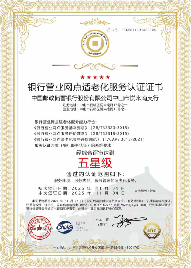 近日,郵儲銀行中山市悅來南支行憑借完善的適老服務(wù)體系、貼心的服務(wù)舉措及專業(yè)的服務(wù)能力,順利通過權(quán)威機構(gòu)適老化服務(wù)專項認證,成為廣東省首批、中山市首個獲此認證的銀行網(wǎng)點,標(biāo)志著該網(wǎng)點適老化金融服務(wù)邁入標(biāo)準(zhǔn)化、規(guī)范化新階段。