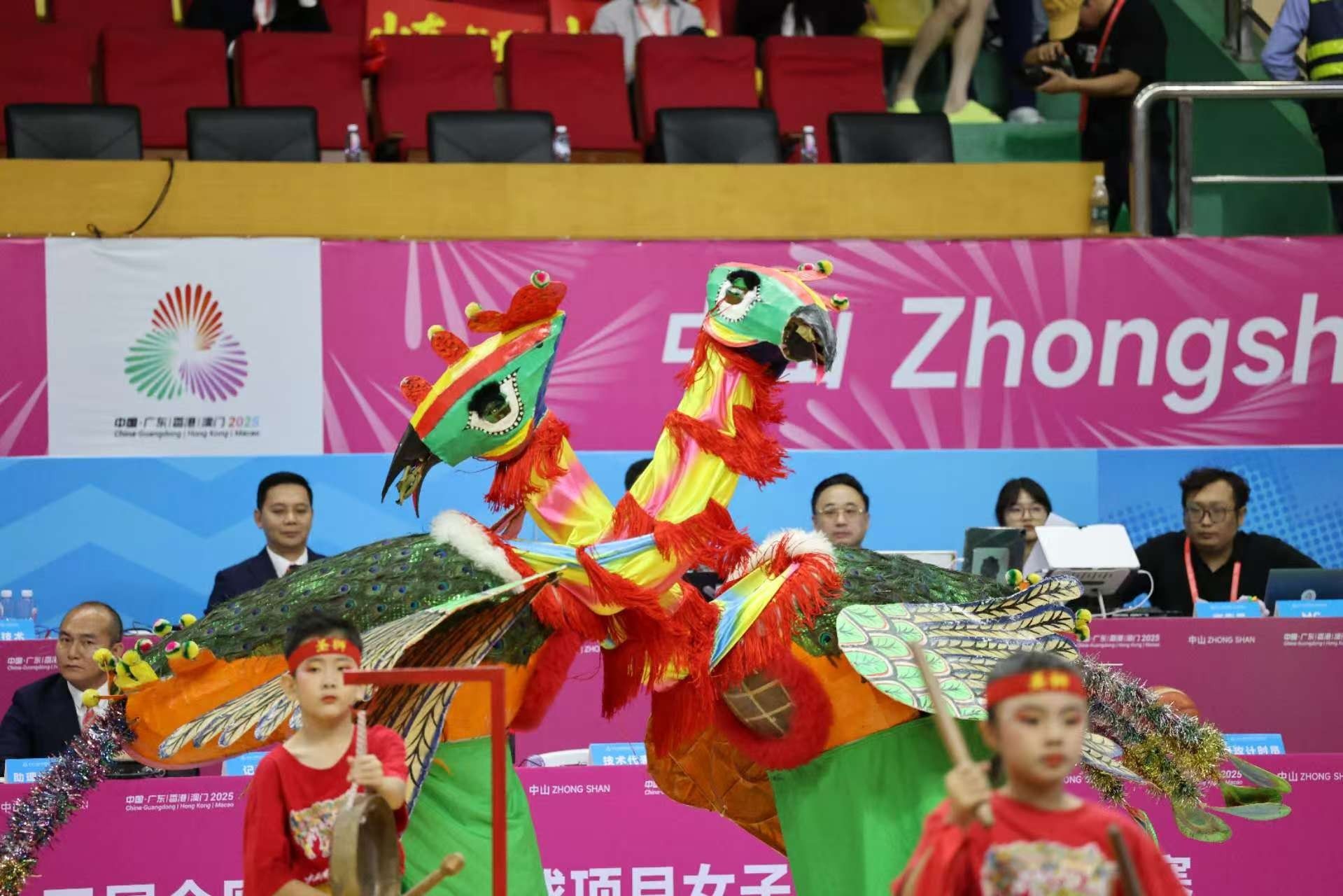 16名小學(xué)生鼓手分持大鼓與小鼓,鼓槌起落間,龍鼓韻律率先響起,一條金黃長龍應(yīng)聲而出,在隊(duì)員們的操控下靈活穿梭,時(shí)而盤旋升空,時(shí)而伏地游走;緊接著鳳鼓奏響,兩只色彩艷麗的鳳凰翩然起舞,與長龍相映成趣;最后獅鼓登場(chǎng),學(xué)生們手持鼓槌,打出清脆明快的節(jié)奏,整場(chǎng)表演在“中山”二字造型的定格中落下帷幕,近4分鐘的演出贏得全場(chǎng)觀眾雷鳴般的掌聲,為緊張的賽事注入了濃郁的傳統(tǒng)文化氣息。