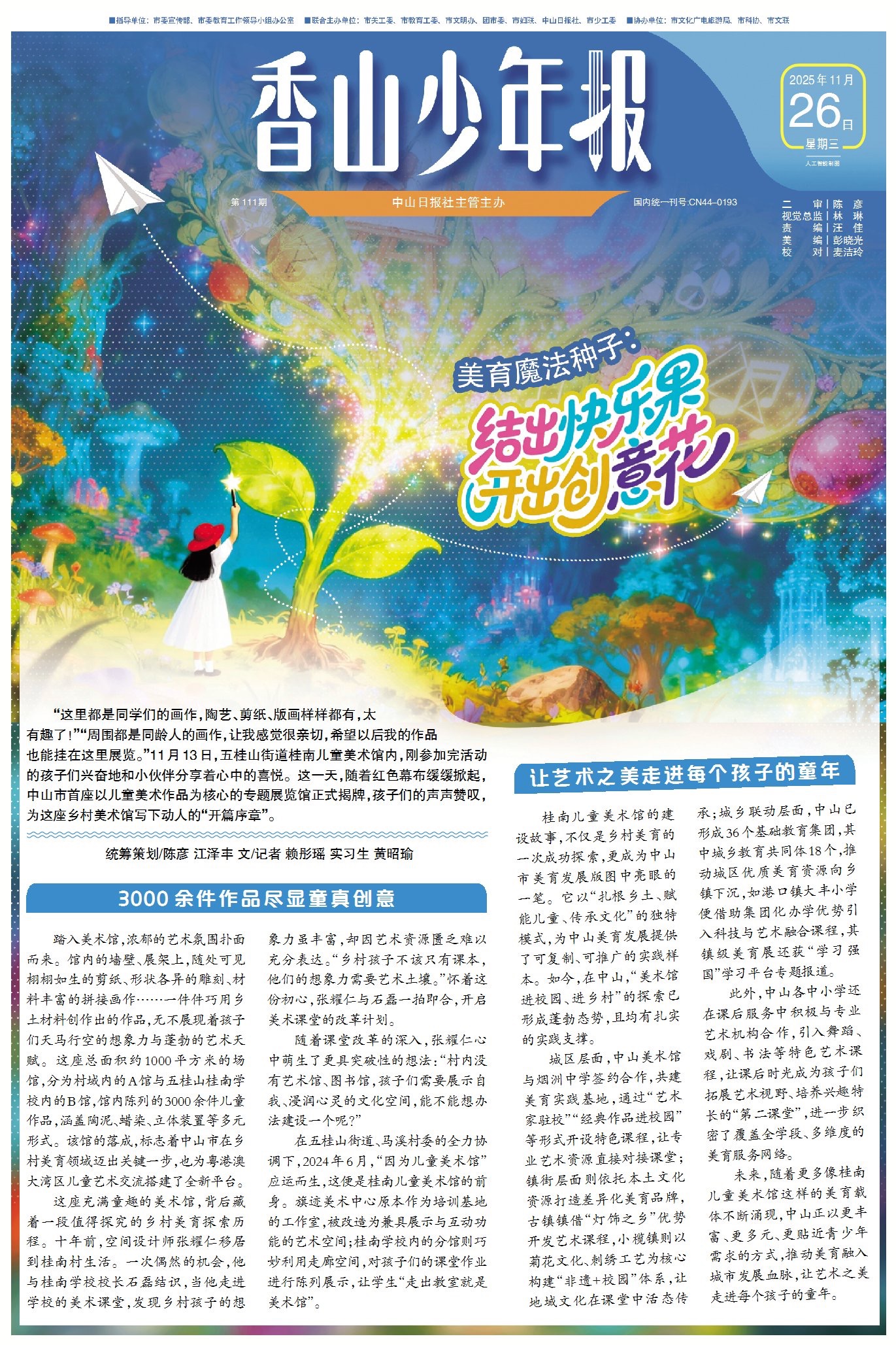 11月13日,中山市首座以兒童美術(shù)作品為核心的專題展覽館——桂南兒童美術(shù)館正式揭牌。這座充滿童趣的美術(shù)館,以“扎根鄉(xiāng)土、賦能兒童、傳承文化”的獨特模式,為中山美育發(fā)展提供了可復制、可推廣的實踐樣本。