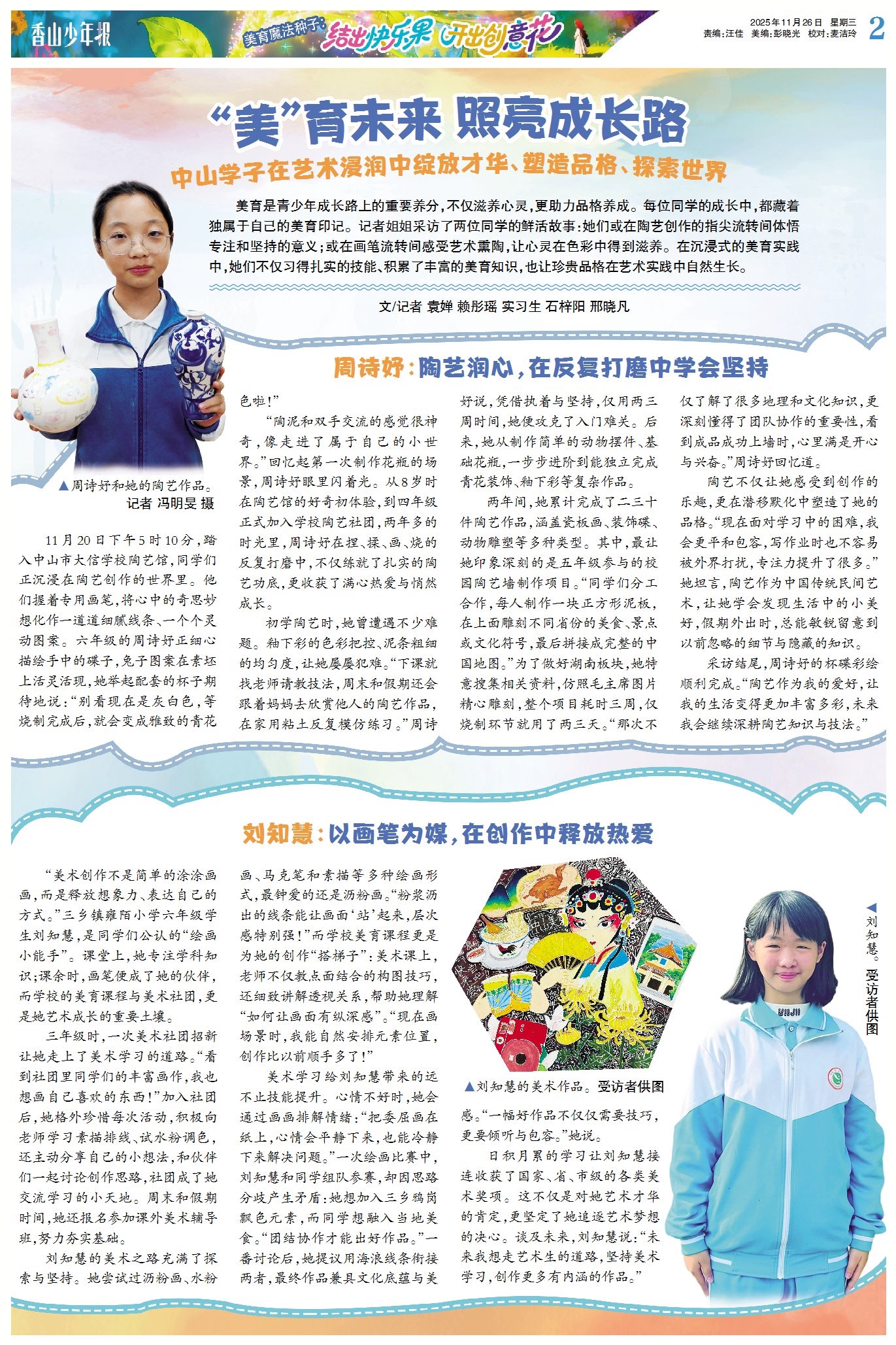 美育是青少年成長路上的重要養(yǎng)分,不僅滋養(yǎng)心靈,更助力品格養(yǎng)成。每位同學的成長中,都藏著獨屬于自己的美育印記。記者姐姐采訪了兩位同學:她們或在陶藝創(chuàng)作的指尖流轉(zhuǎn)間體悟?qū)W⒑蛨猿值囊饬x;或在畫筆流轉(zhuǎn)間感受藝術(shù)熏陶,讓心靈在色彩中得到滋養(yǎng)。在沉浸式的美育實踐中,她們不僅習得扎實的技能、積累了豐富的美育知識,也讓珍貴品格在藝術(shù)實踐中自然生長。(→點擊查看詳情)
