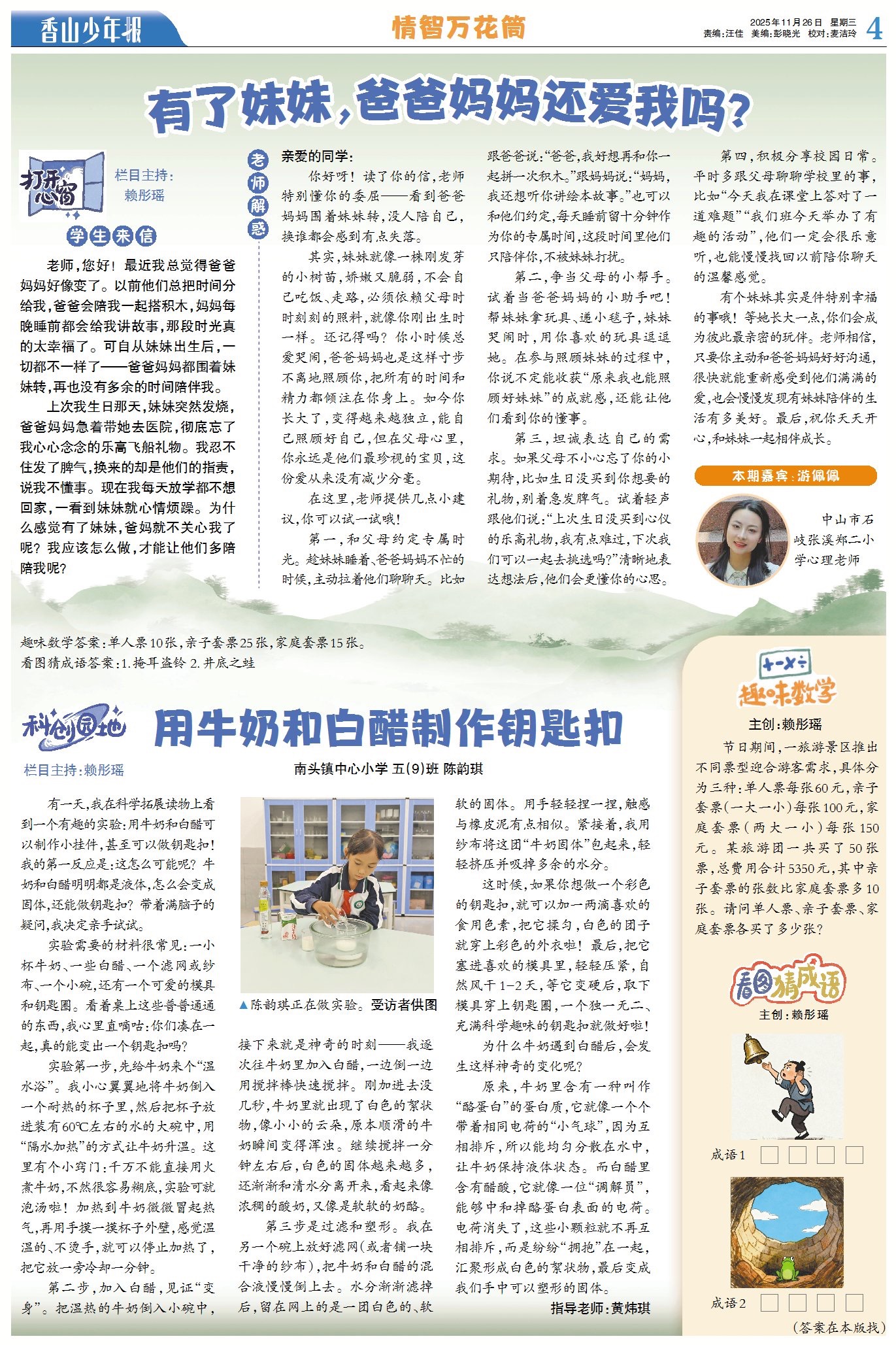有了妹妹,爸爸媽媽陪伴自己的時間變少了,該怎么辦?本期《情智萬花筒》,老師針對同學的這一困惑,給出了暖心解答。在科創(chuàng)園地欄目,同學制作了充滿科學趣味的鑰匙扣,原來牛奶+白醋能產(chǎn)生這么神奇的化學反應!(→點擊查看詳情)
