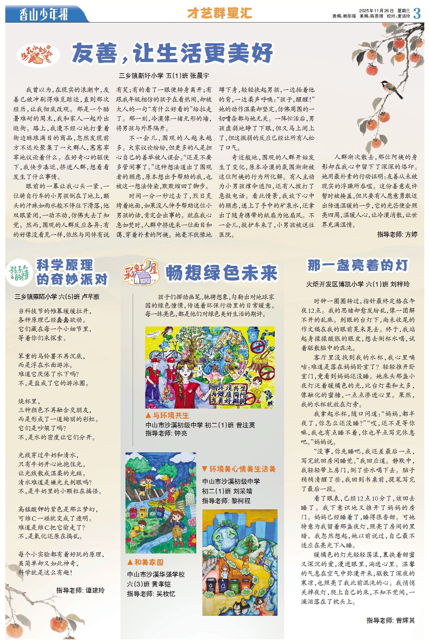 本期《才藝群星匯》,少年們用真心與巧思,勾勒出生活里的美好模樣。有同學分享助人經(jīng)歷,在他人的無畏果斷中感受友善的珍貴;有同學難忘趕作文的深夜,媽媽點亮的那盞燈,盛滿了藏不住的關(guān)愛;還有同學以詩為翼,將科技節(jié)的科學原理化作奇妙派對,讓小實驗在想象中鮮活起舞;彩虹屋里,孩子們揮動畫筆馳騁思緒,用色彩勾勒對地球家園的綠色憧憬,讓環(huán)保暖意藏在每一筆日常里。(→點擊查看詳情)