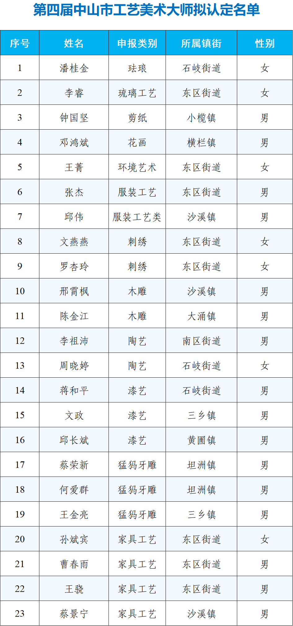 11月27日,中山市工業(yè)和信息化局對外公示第四屆中山市工藝美術(shù)大師擬認(rèn)定名單,潘桂金等23人擬獲中山市工藝美術(shù)大師稱號。