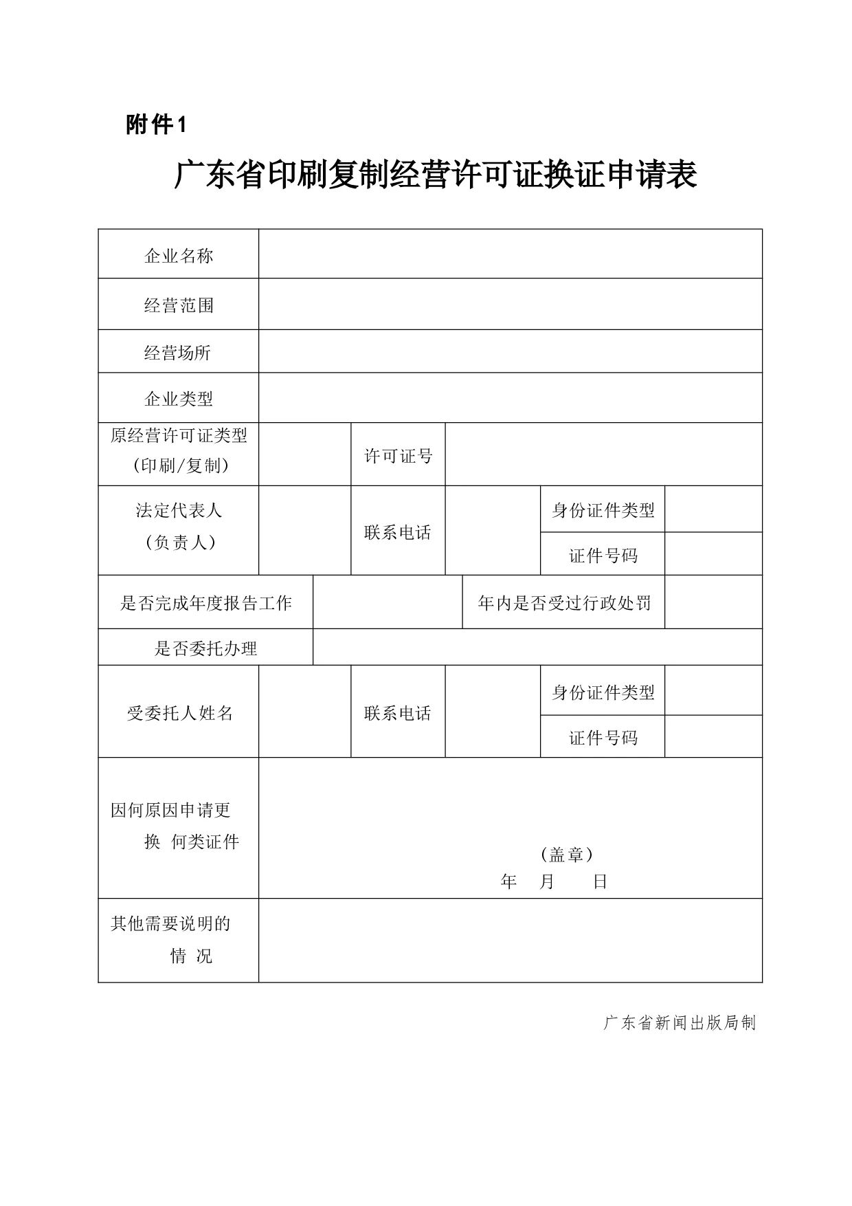 ? ? ? ?5.《廣東省印刷復制經(jīng)營許可證換證申請表》(蓋單位公章)(見下圖)。