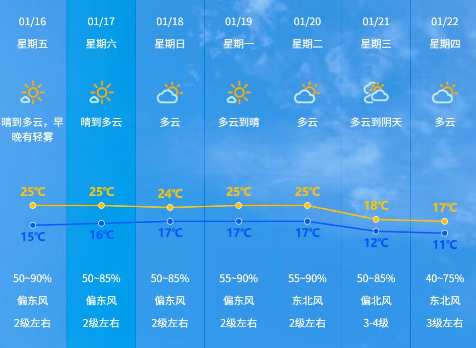 預計16-20日我市晴到多云,早晚有輕霧,天氣溫暖舒適;展望20日夜間受冷空氣影響,我市北風加大,21-22日氣溫明顯下降。