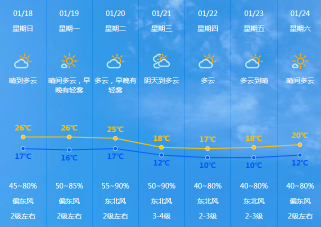 預(yù)計(jì)18-20日我市晴到多云,早晚有輕霧,天氣溫暖舒適;