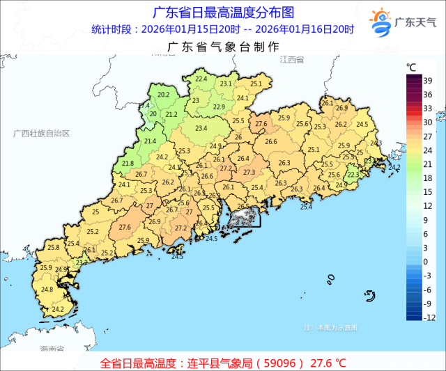 1月16日白天,粵西、肇慶、云浮、清遠(yuǎn)、韶關(guān)多云,汕頭、潮州多云到晴,其余大部晴天。粵西西部、云浮西部、肇慶北部、清遠(yuǎn)和韶關(guān)大部白天最高氣溫較昨日下降了1~7℃;最高氣溫具體分布:肇慶北部、清遠(yuǎn)中北部、韶關(guān)西部、汕頭和湛江東北部介于17~23℃之間,其余大部介于24~27℃,其中河源連平和陽(yáng)江陽(yáng)春錄得全省最高氣溫27.6℃。