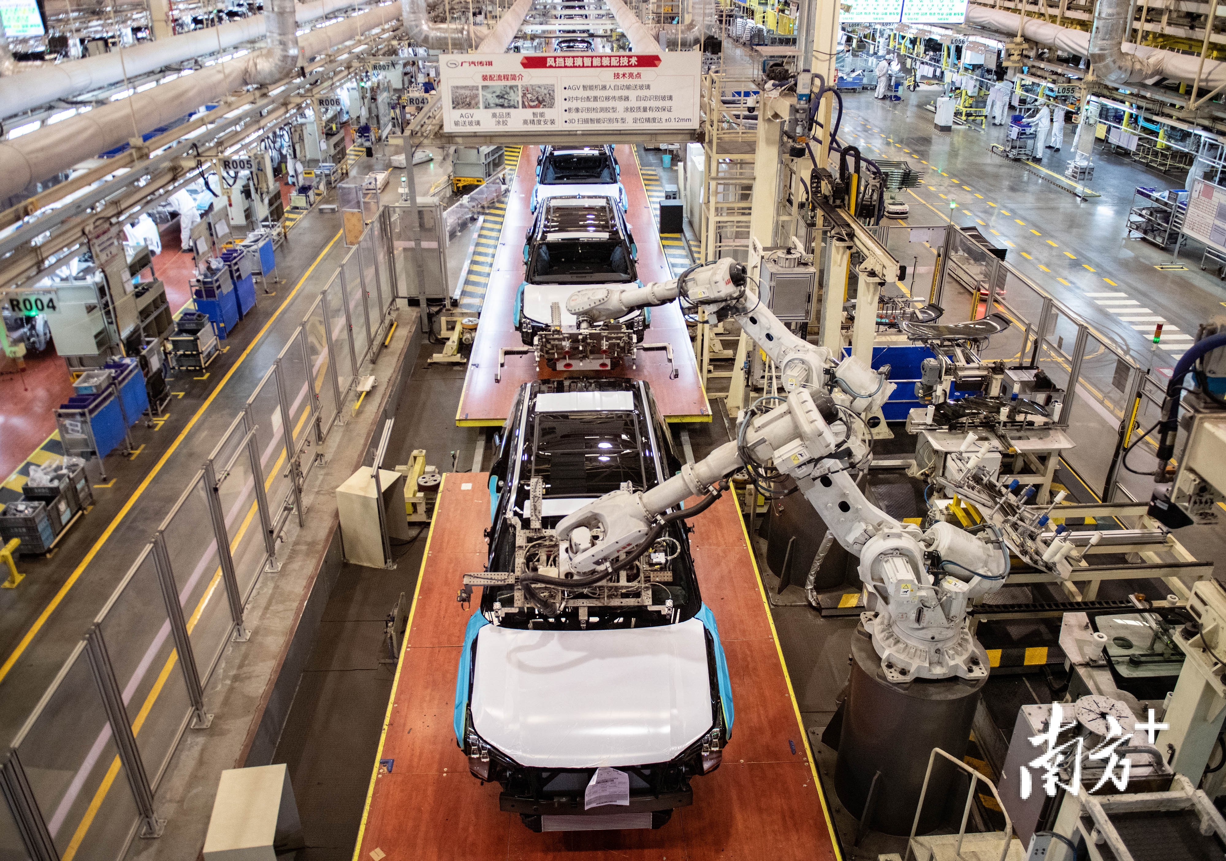 廣汽傳祺廣州工廠第二生產(chǎn)線總裝車間,前后風(fēng)擋玻璃均由機(jī)器人全自動安裝。