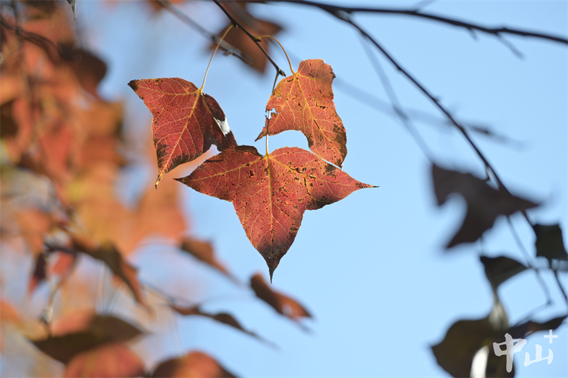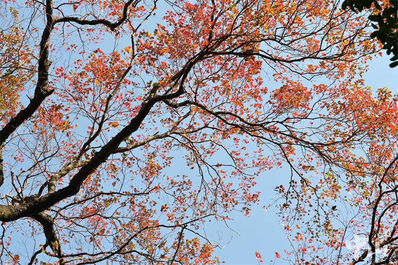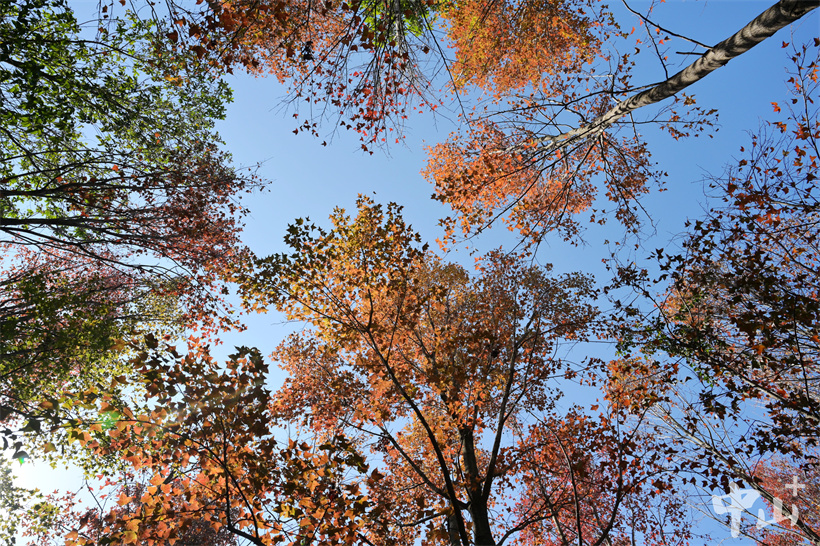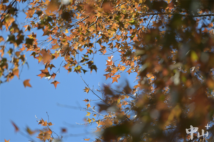 ▲楓香樹(shù)橘紅色的葉子在藍(lán)天的襯托下更加奪目。