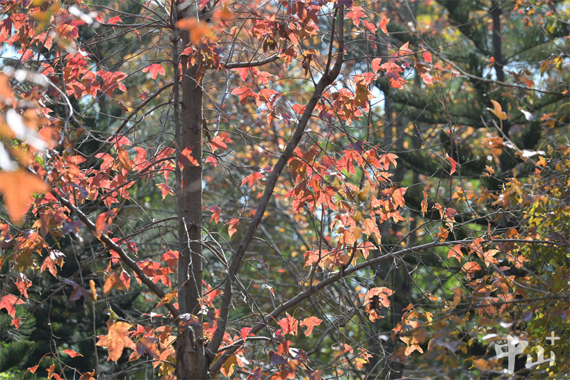 ▲楓香樹(shù)橘黃色的葉與旁邊翠綠的松柏樹(shù)形成了鮮明的對(duì)比。
