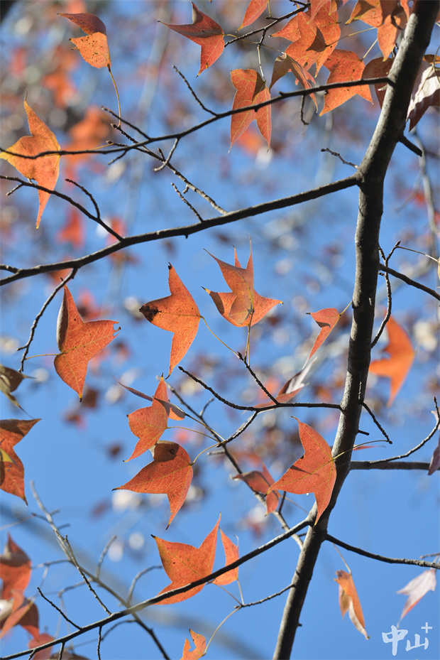▲楓香樹(shù)橘紅色的葉子在陽(yáng)光照耀下顯得格外艷麗。