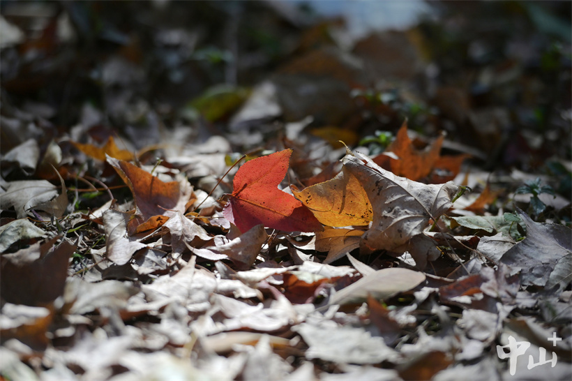 ▲楓香樹(shù)掉落的樹(shù)葉給地面披上了彩色的外衣。