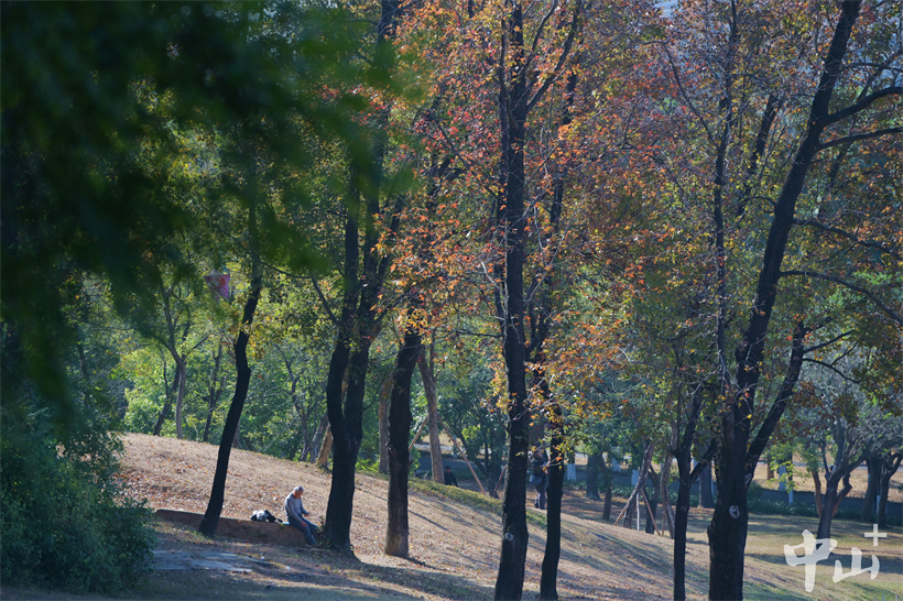 ▲一位市民在色彩絢麗的楓香樹(shù)下休息。