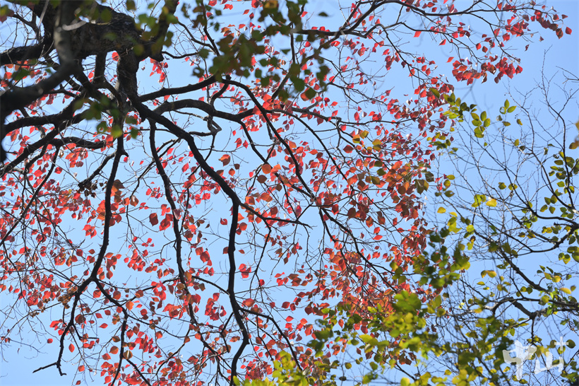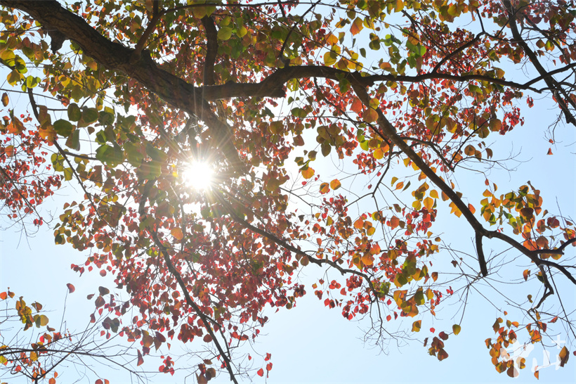 ▲公園里的烏桕樹(shù)葉子逐漸變紅,呈現(xiàn)出五彩斑斕的色彩。