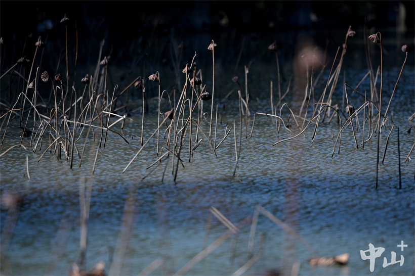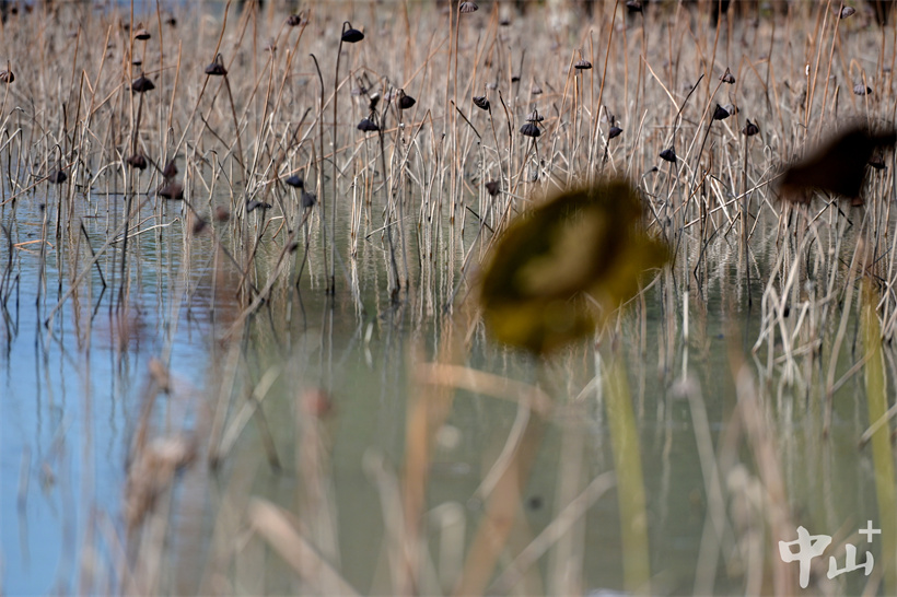 ▲公園里枯萎的荷花在池塘里盡顯蕭瑟之美。