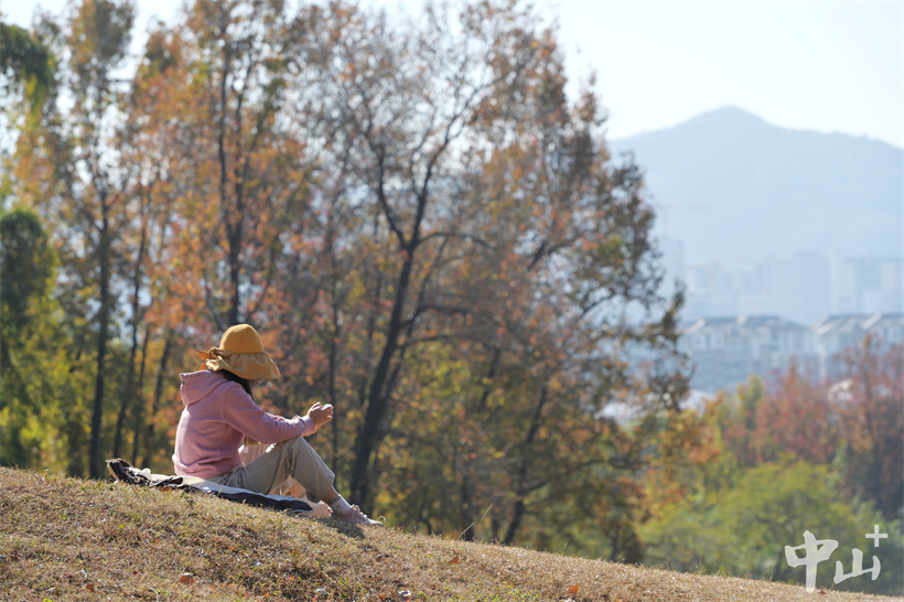▲一位市民坐在“秋色”如畫(huà)的草地上享受冬日暖陽(yáng)。