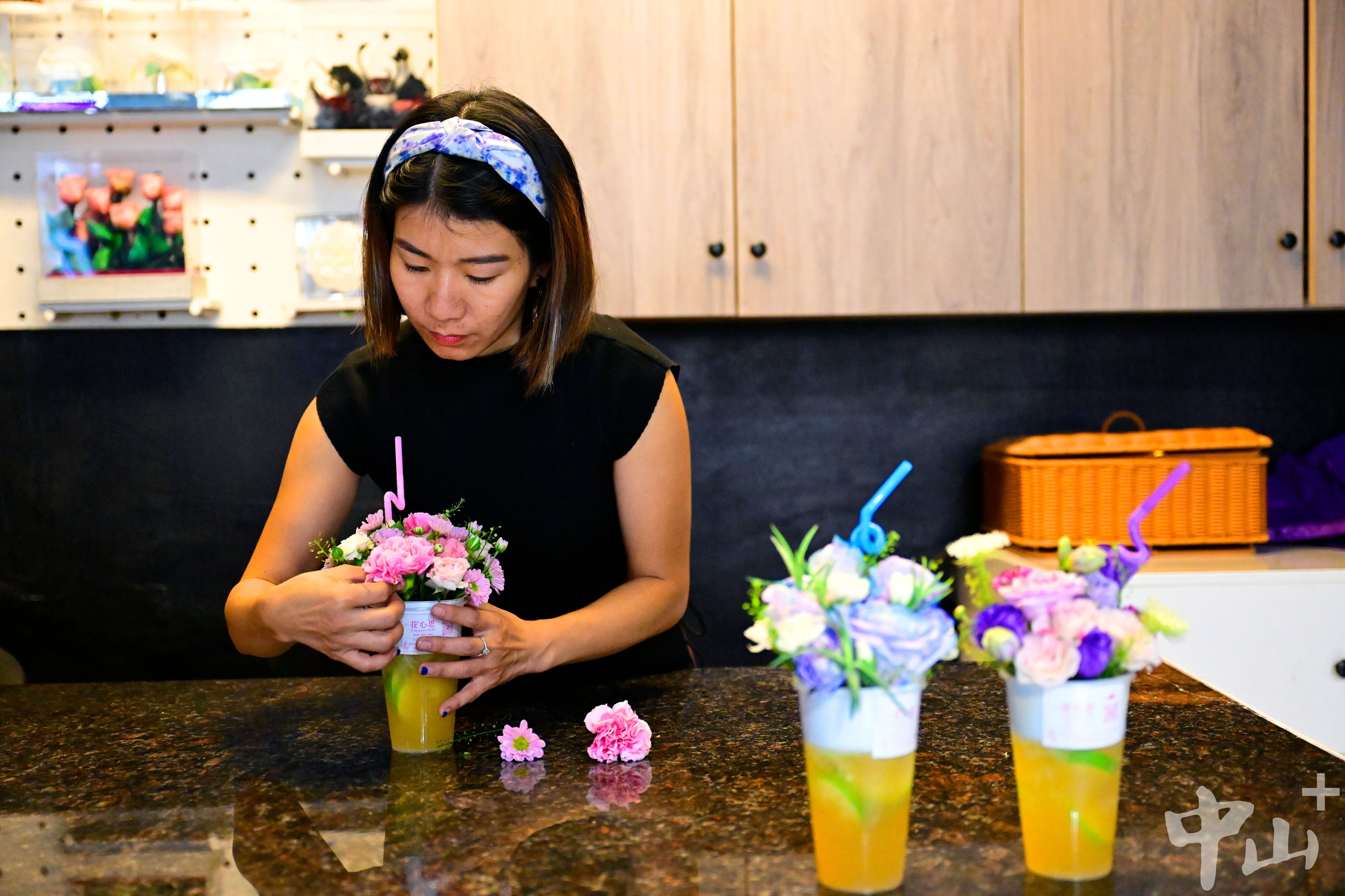 黃嘉欣把鮮花和飲品結(jié)合,客人喝完飲品還能帶走鮮花。記者 余兆宇 攝