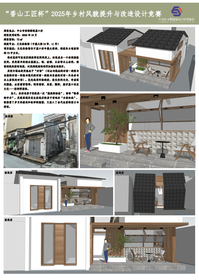 來自中山市規(guī)劃設計院有限公司的王賀飛團隊共報送了6個“鄉(xiāng)村片區(qū)設計項目”,1個“鄉(xiāng)村單體建造項目”,主要位于南朗街道和五桂山街道。在崖口村農(nóng)房風貌管控項目中,團隊不僅提升了建筑立面與屋頂風貌,更結合當?shù)剞r(nóng)業(yè)與稻田景觀特色,重點打造沿線界面,增設休閑桌椅和小空間,同步服務商業(yè)與游客體驗。“項目一期已于去年完工。今年我們優(yōu)化了崖口云吞店一帶傳統(tǒng)區(qū)域的設計并即將完工,鄉(xiāng)村商業(yè)氛圍會越來越濃,進一步激發(fā)鄉(xiāng)村經(jīng)濟活力?!蓖踬R飛表示。
