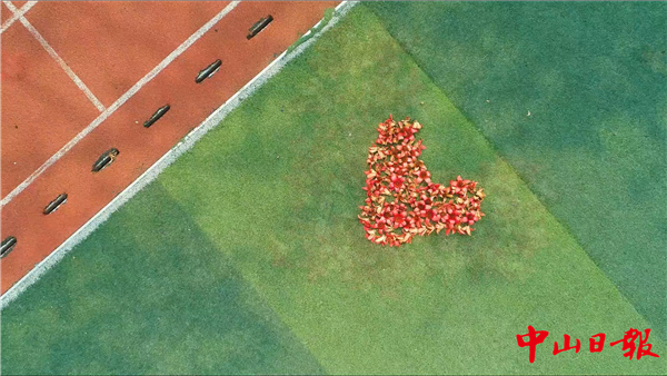 在操場的一角,一株木棉已經(jīng)盛開了滿樹火紅,還有不少已經(jīng)飄落在塑膠跑道上,拾起離開樹梢的木棉花,老師們在翠綠的球場上擺出一個(gè)大大的心型;小蛇、蠟筆小新……