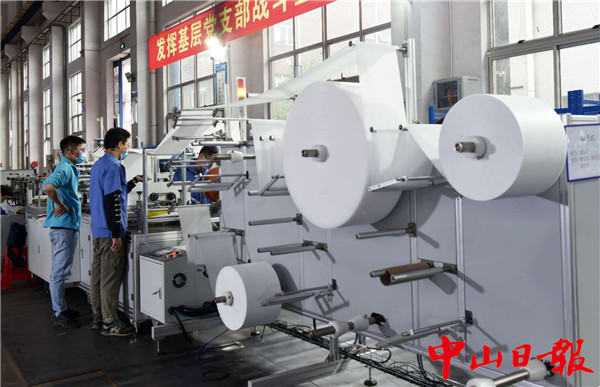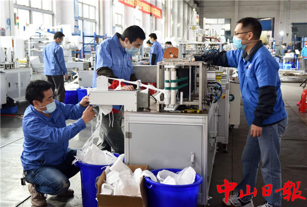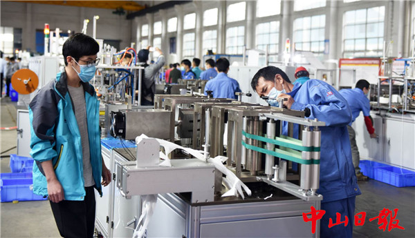 3月30日上午,中山凱旋真空科技股份有限公司生產(chǎn)車間里,工作人員正在忙碌裝配N95口罩機。