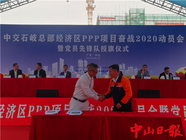 為貫徹落實(shí)中山市奮戰(zhàn)2020年工作動(dòng)員大會(huì)精神和石岐區(qū)工作要求,充分發(fā)揮黨員干部主力軍和先鋒隊(duì)作用,全速推進(jìn)石岐總部經(jīng)濟(jì)區(qū)基礎(chǔ)設(shè)施及公共配套PPP項(xiàng)目投資建設(shè),當(dāng)天上午10點(diǎn)30分,項(xiàng)目投資建設(shè)單位——中交城投還在省一級(jí)小學(xué)施工現(xiàn)場(chǎng)舉行了“中交石岐總部經(jīng)濟(jì)區(qū)PPP項(xiàng)目奮戰(zhàn)2020動(dòng)員會(huì)暨黨員先鋒隊(duì)授旗儀式”,并公布了各個(gè)項(xiàng)目的施工計(jì)劃時(shí)間表。