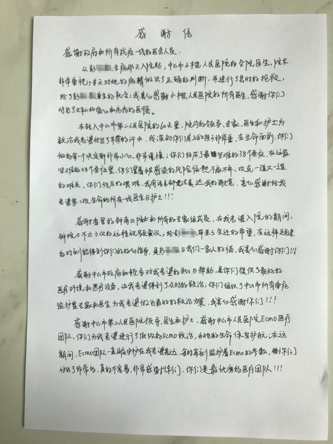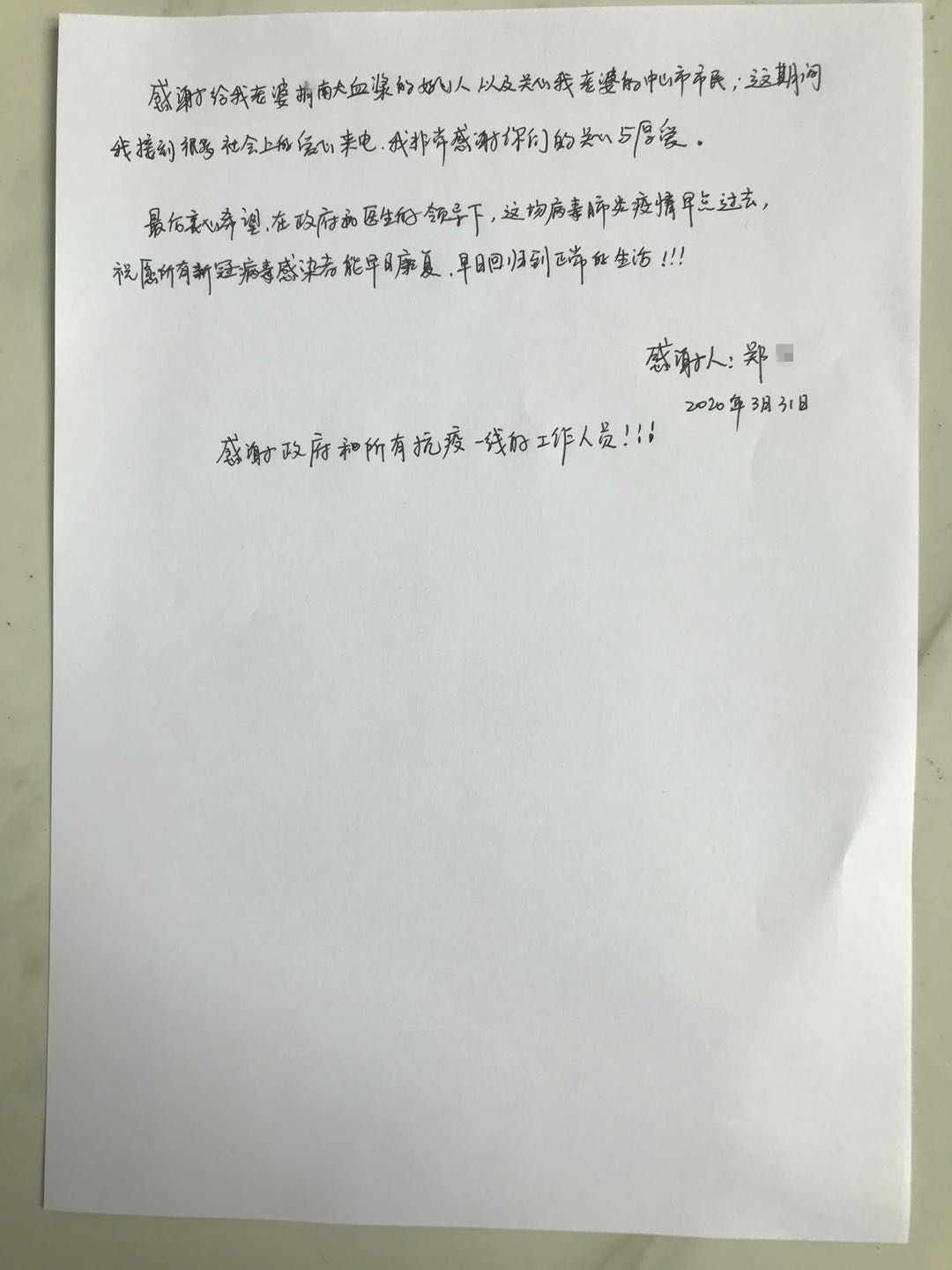 彭女士丈夫鄭先生寫下了一封感謝信。 受訪者提供