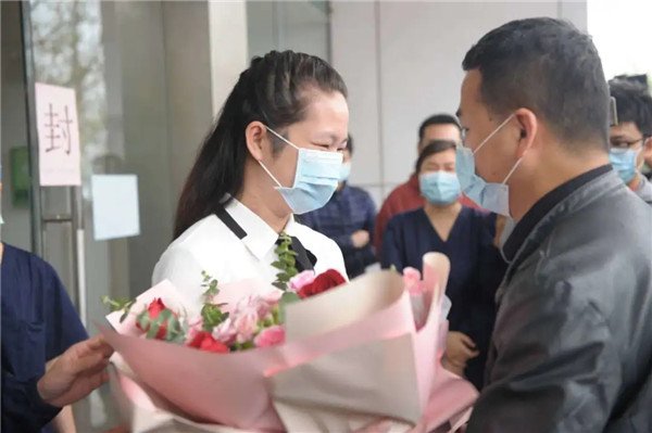 早已守候在門前的丈夫送上了鮮花。記者 文波 攝