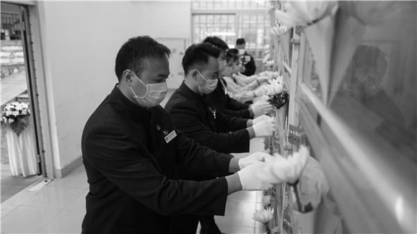 有心思的是,在儀式開始前,市殯儀館還特地將寄存在該館的21582位先人的名字投放在公祭儀式的大屏幕上,以表對每位先人的深切緬懷和追思。儀式結(jié)束后,工作人員踏著低沉地腳步,移步到思親樓,先后為21582位先人的骨灰寄存處敬獻(xiàn)了鮮花一束并鞠躬。