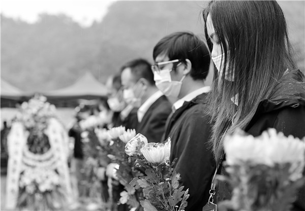 公墓現(xiàn)場一片安靜肅穆,沒有往年的車水馬龍、人來人往。在公墓??祬^(qū)的空地上,公祭儀式在10時準(zhǔn)時開始,禮儀工作人員首先向在全國各族人民對抗擊新冠肺炎疫情斗爭犧牲烈士和逝世同胞默哀,向安葬在市福蔭園的先人默哀。