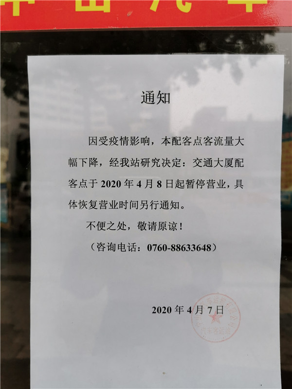 中山市汽車總站4月7日發(fā)出通知稱,因受疫情影響,交通大廈配客點8日起暫停營業(yè)。