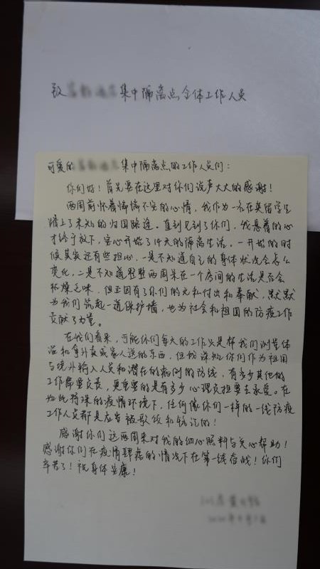 “首先要在這里說聲大大的感謝。兩周前懷著惴惴不安的心情,我作為一名在英留學(xué)生,踏上了未知的歸國路途,直到見到了你們,我懸著的心才終于放下,安心開始了14天的隔離生活。