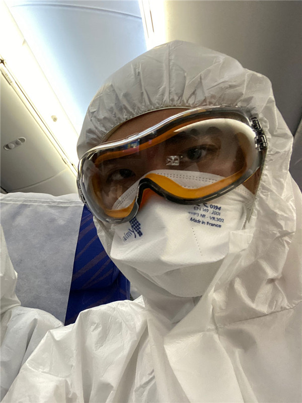 由于學(xué)的是生物化學(xué),防護服、護目鏡、手套、N95口罩這些防疫物資都不缺?!吧巷w機前測了一次體溫,機上測了3次,下飛機還要一個個測試完下機。”他上了飛機就睡覺,沒有摘下過口罩和護目鏡,也沒上過洗手間。飛機上幾乎都是華人,每個人都做了防護,9成以上的乘客穿了防護服?!懊總€人做好防護,是對自己和周邊人的保護?!?/p>