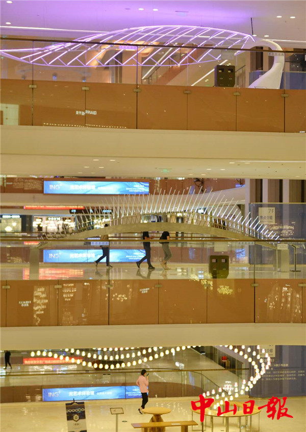 丁瑜表示,華藝廣場一直按文化引領(lǐng)燈飾產(chǎn)業(yè)發(fā)展的思路布局推進(jìn),探索在商貿(mào)綜合體內(nèi)打造美學(xué)空間。7樓連廊擺放著“彩虹·橋之和諧韻舞”,設(shè)計師從斜拉索橋中取得靈感,將數(shù)百根不銹鋼管與氣泡亞克力管做成巨型藝術(shù)燈。