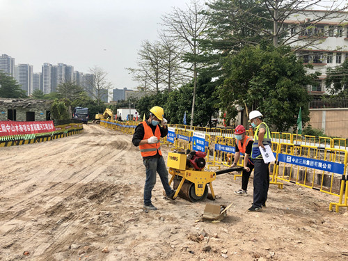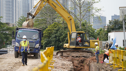 施工現(xiàn)場,工人頭戴安全帽、身披亮色馬夾,戴著口罩與手套,一片忙碌。周軍介紹,施工過程中,鋼板裝機(jī)先在排洪渠周邊打下鋼板樁,然后再由挖掘機(jī)挖掘出溝槽,工人做好溝槽基礎(chǔ)后才鋪設(shè)管道,截至目前大小鰲溪排洪渠的排污管道安裝已經(jīng)完成50米?!罢麄€(gè)大小鰲溪排洪渠需安裝排污管道4000米?!敝苘娬f。