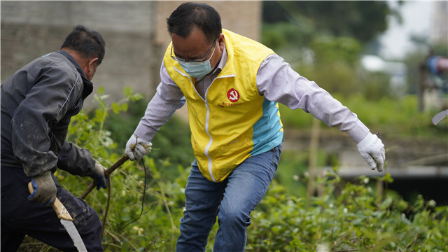 10分鐘不到,小小的三輪車變被裝滿了,此時一名身穿雨鞋,帶著黑色袖套的保潔人員,矯健的爬上三輪車內(nèi),用腳踩實雜草,不讓其在運(yùn)輸過程中掉落。清理完雜草之后,現(xiàn)場的黨員群眾用掃帚清掃路面,不一會整條村道便比之前干凈、整潔了許多。