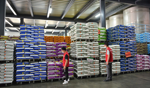 在隔壁的糧食生產(chǎn)車間,記者看到,工人正在投料,這些半成品經(jīng)過鐵桶倉和生產(chǎn)線,按照不同的規(guī)格進行包裝,由機械手將包裝好的成品“抓”起來整齊碼放好。“我們這條生產(chǎn)線從貨源下車到成品出貨,基本不需要肩膀,一線員工只有10多個人。”
