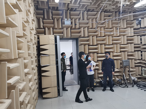 必維嘉航隔壁就是VDE公司建設(shè)的檢驗檢測中心,大約600平方米的檢驗檢測中心被劃分成多個檢驗室、區(qū),負責不同的產(chǎn)品檢測。一臺小家電被工作人員放在了噪音檢測實驗室的平臺上,通過布滿墻壁的特殊材料傳感器,小家電發(fā)出的噪音,約一秒就能顯示在實驗室外面的電腦屏幕上。