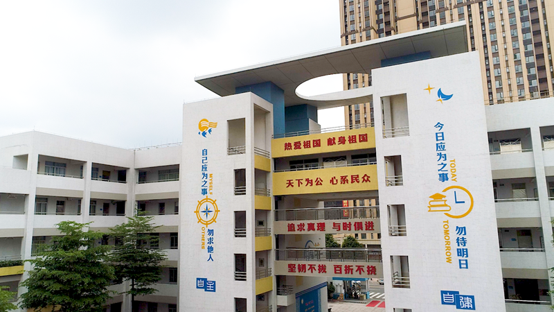 走進(jìn)中山一中西區(qū)中學(xué)的校園,左側(cè)墻壁上的一則對聯(lián)展示著師生揚帆書海、再創(chuàng)佳績的決心,以藍(lán)色、黃色為主要色調(diào),句句振奮人心的標(biāo)語鼓舞著師生奮發(fā)向前。