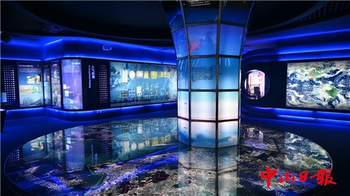 中山氣象科普館位于氣象局二樓,是中山市氣象科普教育基地的重要組成部分,包裹在柔和的藍(lán)色燈光下,近500平方米的科普館是眾多氣象愛好者的樂園?!皩ο坛薄⒈┯旰团_風(fēng)等常見現(xiàn)象進(jìn)行科普的同時,我們還在地面鋪設(shè)了中山市及周邊地區(qū)地形地貌的衛(wèi)星圖,就連柱子也被利用起來、成為展示大氣層相關(guān)知識的載體?!绷罕谭颊f。
