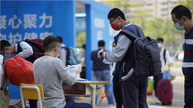 在學(xué)校門口,學(xué)生必須在進(jìn)行電子測溫、登記《健康卡》等資料后,才能進(jìn)入校園。