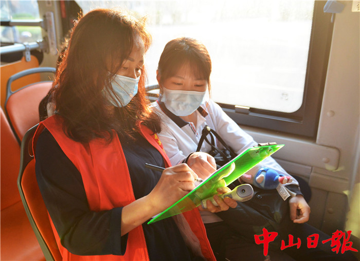 此時(shí),駕駛員黎清豪正在做體溫自檢、消毒、防疫物資清點(diǎn)等發(fā)車前的準(zhǔn)備工作,專線車的安全員東區(qū)中學(xué)高三語文老師陳媛也已到位,公交車隨即啟動(dòng)出場(chǎng),前往第一個(gè)接載學(xué)生的站點(diǎn)“會(huì)展東路中”。
