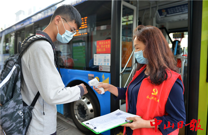 6點(diǎn)25分,公交車到達(dá)“會(huì)展東路中”站,高三學(xué)生李思遠(yuǎn)在爸爸的陪同下,步行走出小區(qū),準(zhǔn)時(shí)到達(dá)指定上車點(diǎn)。陳媛下車給學(xué)生測(cè)量體溫,仔細(xì)做好記錄,并安排學(xué)生上車就座。