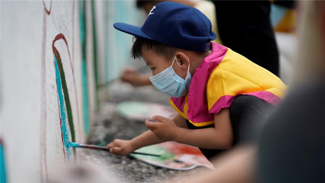 上午9點多,記者現(xiàn)場看到,按繪畫老師的勾邊和色號提示,近百名志愿者拿著畫筆蘸上顏料細心涂抹。在手繪墻中間,一個棕色與綠色的調(diào)色盤被3個10多歲的小志愿者擺放在地上,只見他們每人左手拿著一塊小紙板,右手拿著畫筆,半蹲著或佝僂著腰,一筆一筆對著墻上的樹干和綠葉耐心涂抹上色。
