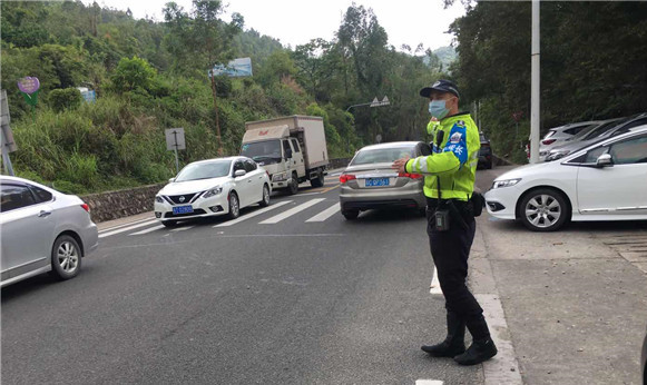 5月1日上午8點(diǎn)30分,蔡錫銳和隊友們早早來到中山田心森林公園執(zhí)勤,一天的主要任務(wù)就是為假期前往公園游玩的游客服務(wù),疏導(dǎo)公園門口路段交通。當(dāng)天上午10時許,公園門口車來車往,游客如織,只見蔡錫銳不停揮舞著雙臂,指揮車輛有序進(jìn)出公園。