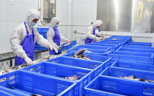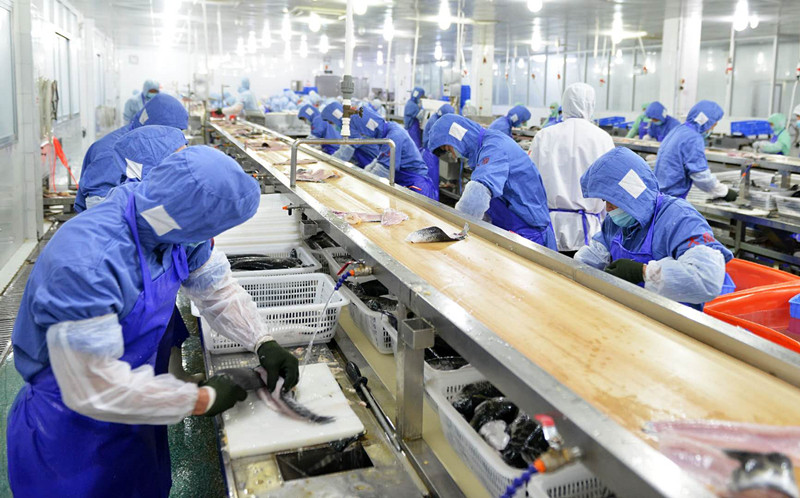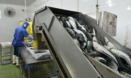 車間里,一批包裝好的冷凍魚片,正準(zhǔn)備出口往以色列。為了抗擊外銷的風(fēng)險(xiǎn),該公司早年已從單一的北美市場,逐漸擴(kuò)大到北美,南美,歐洲,中東,東南亞等地區(qū),目前已經(jīng)取得歐盟、美國、俄羅斯、韓國以及新西蘭等國家地區(qū)的出口資質(zhì)。然而今年疫情沖擊下,外銷市場銷量急劇下降。