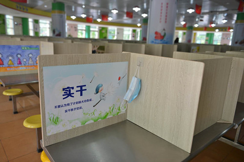 記者在學(xué)校其中一個(gè)食堂——知辛閣看到,不銹鋼的長(zhǎng)餐桌上已擺放了隔板,每個(gè)座位都被三面板圍成了小格子間。坐在小格子間里吃飯,看不到左右兩邊和前面的人,無法面對(duì)面交流。一個(gè)人吃飯,會(huì)不會(huì)覺得孤獨(dú)?貼心的學(xué)校還準(zhǔn)備了“心靈雞湯”?!皦?mèng)想——如果你背后有陽(yáng)光,就不怕前有陰影”“信念——信仰在哪里,幸福就在哪里”“創(chuàng)造力——踩著前人的腳印前進(jìn),最佳結(jié)果也只能是亞軍。”格子間隔板上貼著的各種漂亮海報(bào),溫暖的文字,如此心靈雞湯,陪伴同學(xué)們渡過這一小段“孤獨(dú)食堂“的時(shí)間。而在格子間的右上角,還貼上了小掛勾,以防吃飯前脫下的口罩無處安放。