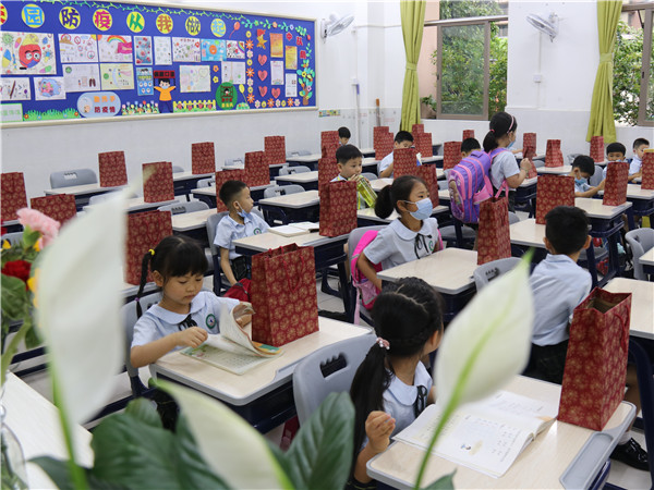“按照防疫要求,我們把教室內(nèi)的桌椅排成單人單桌。每張桌面貼上學(xué)生的名字,方便孩子們返校后順利找到自己的座位?!痹谑行男W(xué)一年級(3)班教室內(nèi),班主任老師阮允良正引導(dǎo)返校的學(xué)生尋找自己的新位置。師生好幾個月沒見面,相互分享起了假期心得。