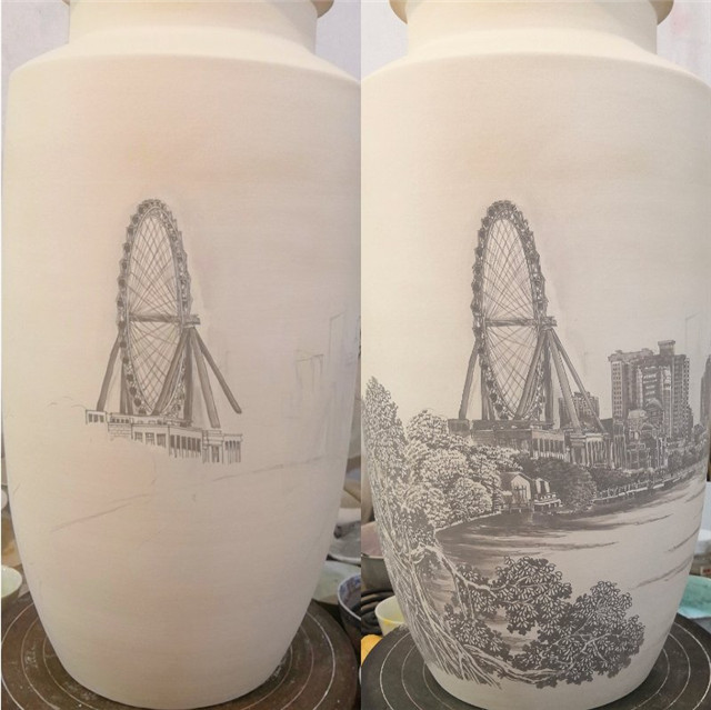 潔白的陶瓷上,一株枝葉繁茂的榕樹(shù)正盡情伸展,當(dāng)目光追隨著不斷延伸的道路,栩栩如生的幻彩摩天輪就出現(xiàn)在盡頭,這是以岐江河為原型,由來(lái)自景陶創(chuàng)意定制工作室的周曉婷、周潤(rùn)洪父女精心創(chuàng)作的系列作品“中山十景”之一。融會(huì)多種陶藝并進(jìn)行探索、創(chuàng)造,父女倆從2019年9月開(kāi)始創(chuàng)作這一系列陶藝作品,根據(jù)孫文公園、孫中山紀(jì)念堂以及煙墩山塔景色繪制的青花瓷均已在石岐區(qū)安欄路的工作室中展出,“小時(shí)候,與奶奶一起在孫中山紀(jì)念堂玩耍的場(chǎng)景仍歷歷在目。作為地道的中山人,我希望借此打破年輕一輩與過(guò)去的隔閡,讓他們認(rèn)識(shí)中山別具特色的種種美景?!敝軙枣眯χf(shuō)。