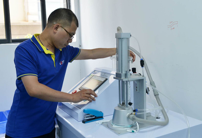 記者走進(jìn)靠近門口的一間實驗室里,四臺“過濾效率測試儀”一字?jǐn)[開,眼前的一臺設(shè)備發(fā)出輕微的“咕咕”聲,機(jī)器正將石蠟油與空氣混合成氣溶膠,測試口罩的過濾效果。這是專門針對出口歐盟的個人防護(hù)N95口罩的油性顆粒過濾進(jìn)行測試。