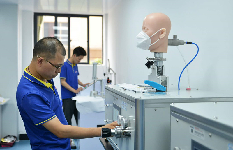 蔣富裕介紹,大多口罩生產(chǎn)企業(yè)在總泄漏率測試這一關(guān)“折戟”。測試員會戴上口罩,在玻璃屋內(nèi)做出跑步、搖頭、朗讀等5組動作,模擬實際穿戴后的泄漏效果,簡言之就是要看口罩在實際穿戴中的防護(hù)效果好不好?!半y點在于,口罩既要密封嚴(yán)防帶細(xì)菌、病毒的有害顆粒侵入,又不能讓佩戴者感到不舒適。由于歐盟對這項要求非常高,鮮有企業(yè)有一次性通過的。”蔣富裕介紹。